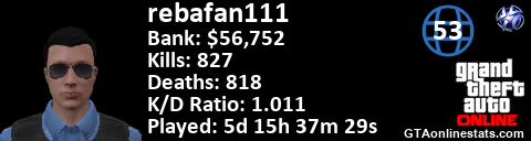<a href="http://GTAonlinestats.com/showplayer/rebafan111"><img src="http://GTAonlinestats.com/randomsignature/rebafan111/sig.png" alt="rebafan111" border="0" /></a>