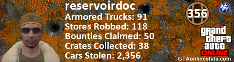 [URL=http://GTAonlinestats.com/showplayer/reservoirdoc][IMG]http://GTAonlinestats.com/signature/reservoirdoc/sig.png[/IMG][/URL]