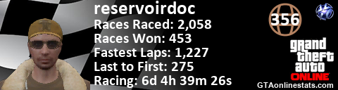 [URL=http://GTAonlinestats.com/showplayer/reservoirdoc][IMG]http://GTAonlinestats.com/racesignature/reservoirdoc/sig.png[/IMG][/URL]
