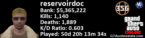 <a href="http://GTAonlinestats.com/showplayer/reservoirdoc"><img src="http://GTAonlinestats.com/signature/reservoirdoc/sig.png" alt="reservoirdoc" border="0" /></a>