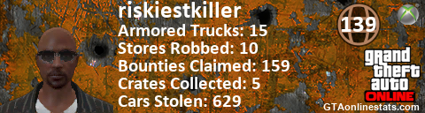 [URL=http://GTAonlinestats.com/showplayer/riskiestkiller][IMG]http://GTAonlinestats.com/crimesignature/riskiestkiller/sig.png[/IMG][/URL]