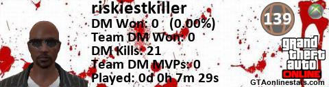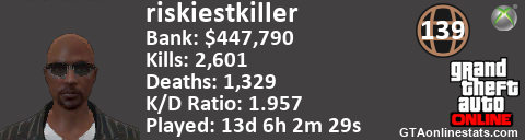 [URL=http://GTAonlinestats.com/showplayer/riskiestkiller][IMG]http://GTAonlinestats.com/dmsignature/riskiestkiller/sig.png[/IMG][/URL]