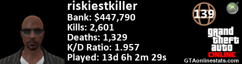 [URL=http://GTAonlinestats.com/showplayer/riskiestkiller][IMG]http://GTAonlinestats.com/signature/riskiestkiller/sig.png[/IMG][/URL]