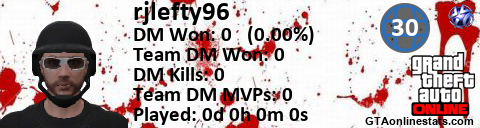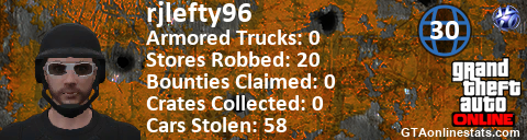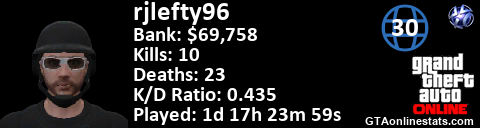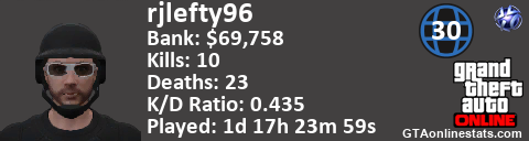 <a href="http://GTAonlinestats.com/showplayer/rjlefty96"><img src="http://GTAonlinestats.com/randomsignature/rjlefty96/sig.png" alt="rjlefty96" border="0" /></a>
