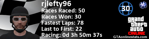 [URL=http://GTAonlinestats.com/showplayer/rjlefty96][IMG]http://GTAonlinestats.com/racesignature/rjlefty96/sig.png[/IMG][/URL]