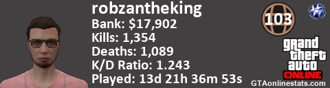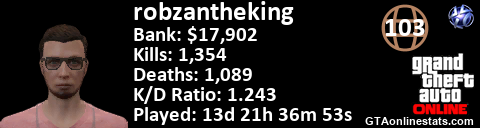 <a href="http://GTAonlinestats.com/showplayer/robzantheking"><img src="http://GTAonlinestats.com/randomsignature/robzantheking/sig.png" alt="robzantheking" border="0" /></a>