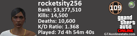<a href="http://GTAonlinestats.com/showplayer/rocketsity256/2"><img src="http://GTAonlinestats.com/greysignature/rocketsity256/2/sig.png" alt="rocketsity256" border="0" /></a>