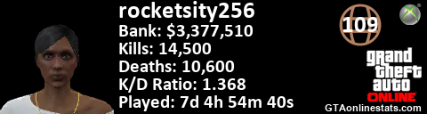 <a href="http://GTAonlinestats.com/showplayer/rocketsity256/2"><img src="http://GTAonlinestats.com/signature/rocketsity256/2/sig.png" alt="rocketsity256" border="0" /></a>