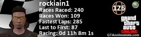 <a href="http://GTAonlinestats.com/showplayer/rockiain1"><img src="http://GTAonlinestats.com/racesignature/rockiain1/sig.png" alt="rockiain1" border="0" /></a>