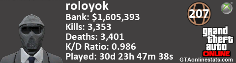 [URL=http://GTAonlinestats.com/showplayer/roloyok][IMG]http://GTAonlinestats.com/signature/roloyok/sig.png[/IMG][/URL]