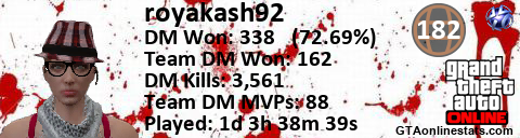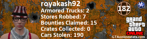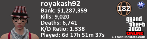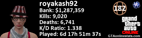 [URL=http://GTAonlinestats.com/showplayer/royakash92][IMG]http://GTAonlinestats.com/signature/royakash92/sig.png[/IMG][/URL]