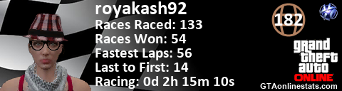 <a href="http://GTAonlinestats.com/showplayer/royakash92"><img src="http://GTAonlinestats.com/racesignature/royakash92/sig.png" alt="royakash92" border="0" /></a>