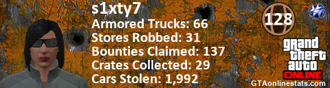 [URL=http://GTAonlinestats.com/showplayer/s1xty7][IMG]http://GTAonlinestats.com/crimesignature/s1xty7/sig.png[/IMG][/URL]