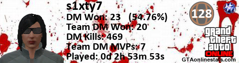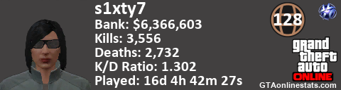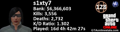 [URL=http://GTAonlinestats.com/showplayer/s1xty7][IMG]http://GTAonlinestats.com/signature/s1xty7/sig.png[/IMG][/URL]