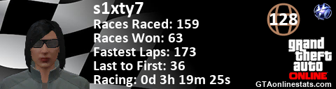 <a href="http://GTAonlinestats.com/showplayer/s1xty7"><img src="http://GTAonlinestats.com/racesignature/s1xty7/sig.png" alt="s1xty7" border="0" /></a>