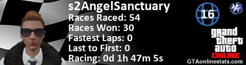 <a href="http://GTAonlinestats.com/showplayer/s2AngelSanctuary/2"><img src="http://GTAonlinestats.com/racesignature/s2AngelSanctuary/2/sig.png" alt="s2AngelSanctuary" border="0" /></a>