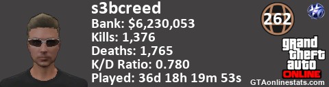 <a href="http://GTAonlinestats.com/showplayer/s3bcreed"><img src="http://GTAonlinestats.com/dmsignature/s3bcreed/sig.png" alt="s3bcreed" border="0" /></a>