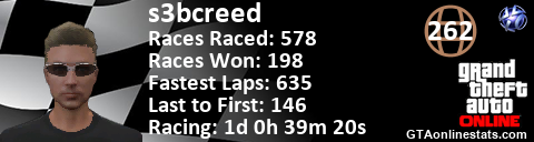 [URL=http://GTAonlinestats.com/showplayer/s3bcreed][IMG]http://GTAonlinestats.com/racesignature/s3bcreed/sig.png[/IMG][/URL]