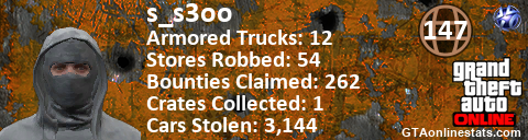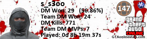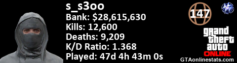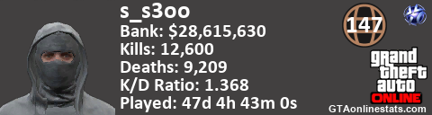 <a href="http://GTAonlinestats.com/showplayer/s_s3oo"><img src="http://GTAonlinestats.com/dmsignature/s_s3oo/sig.png" alt="s_s3oo" border="0" /></a>
