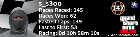 <a href="http://GTAonlinestats.com/showplayer/s_s3oo"><img src="http://GTAonlinestats.com/racesignature/s_s3oo/sig.png" alt="s_s3oo" border="0" /></a>