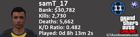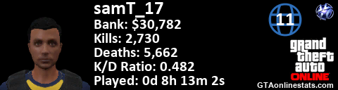 <a href="http://GTAonlinestats.com/showplayer/samT_17"><img src="http://GTAonlinestats.com/signature/samT_17/sig.png" alt="samT_17" border="0" /></a>