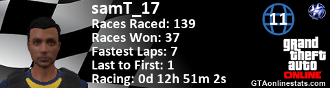 [URL=http://GTAonlinestats.com/showplayer/samT_17][IMG]http://GTAonlinestats.com/racesignature/samT_17/sig.png[/IMG][/URL]