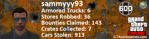 [URL=http://GTAonlinestats.com/showplayer/sammyyy93][IMG]http://GTAonlinestats.com/signature/sammyyy93/sig.png[/IMG][/URL]