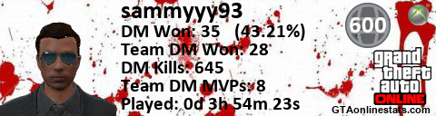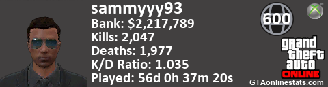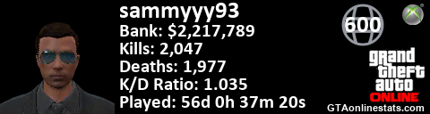 <a href="http://GTAonlinestats.com/showplayer/sammyyy93"><img src="http://GTAonlinestats.com/dmsignature/sammyyy93/sig.png" alt="sammyyy93" border="0" /></a>