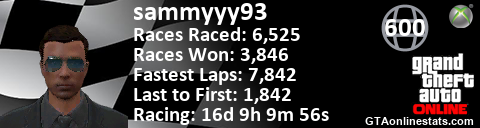 <a href="http://GTAonlinestats.com/showplayer/sammyyy93"><img src="http://GTAonlinestats.com/racesignature/sammyyy93/sig.png" alt="sammyyy93" border="0" /></a>