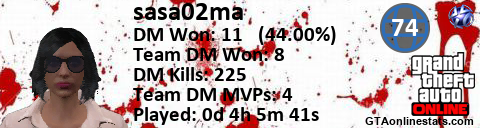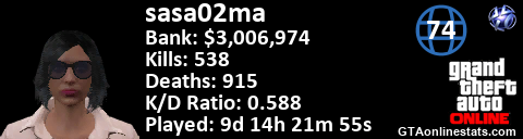 <a href="http://GTAonlinestats.com/showplayer/sasa02ma"><img src="http://GTAonlinestats.com/dmsignature/sasa02ma/sig.png" alt="Sasa02ma" border="0" /></a>