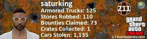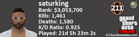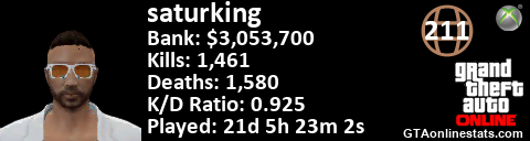 [URL=http://GTAonlinestats.com/showplayer/saturking][IMG]http://GTAonlinestats.com/dmsignature/saturking/sig.png[/IMG][/URL]
