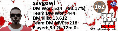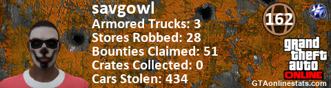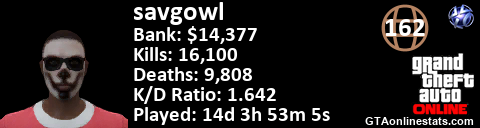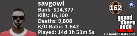 [URL=http://GTAonlinestats.com/showplayer/savgowl][IMG]http://GTAonlinestats.com/signature/savgowl/sig.png[/IMG][/URL]