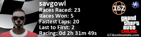[URL=http://GTAonlinestats.com/showplayer/savgowl][IMG]http://GTAonlinestats.com/racesignature/savgowl/sig.png[/IMG][/URL]