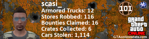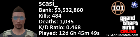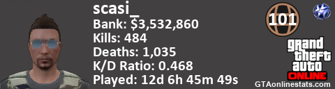 [URL=http://GTAonlinestats.com/showplayer/scasi_][IMG]http://GTAonlinestats.com/signature/scasi_/sig.png[/IMG][/URL]