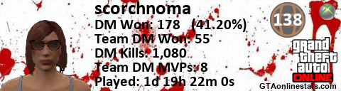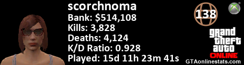 [URL=http://GTAonlinestats.com/showplayer/scorchnoma/2][IMG]http://GTAonlinestats.com/signature/scorchnoma/2/sig.png[/IMG][/URL]