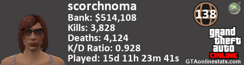 <a href="http://GTAonlinestats.com/showplayer/scorchnoma/2"><img src="http://GTAonlinestats.com/signature/scorchnoma/2/sig.png" alt="scorchnoma" border="0" /></a>