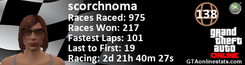 [URL=http://GTAonlinestats.com/showplayer/scorchnoma/2][IMG]http://GTAonlinestats.com/racesignature/scorchnoma/2/sig.png[/IMG][/URL]