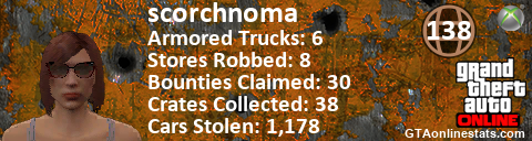 [URL=http://GTAonlinestats.com/showplayer/scorchnoma/2][IMG]http://GTAonlinestats.com/randomsignature/scorchnoma/2/sig.png[/IMG][/URL]