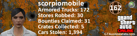 [URL=http://GTAonlinestats.com/showplayer/scorpiomobile][IMG]http://GTAonlinestats.com/crimesignature/scorpiomobile/sig.png[/IMG][/URL]