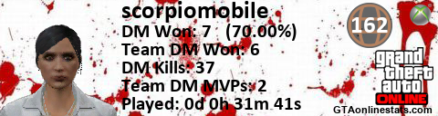 [URL=http://GTAonlinestats.com/showplayer/scorpiomobile][IMG]http://GTAonlinestats.com/racesignature/scorpiomobile/sig.png[/IMG][/URL]