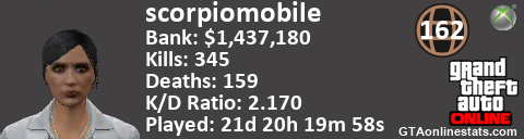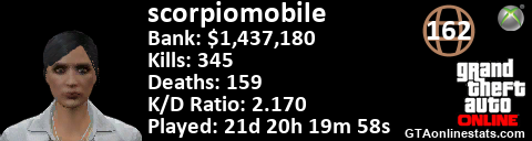 <a href="http://GTAonlinestats.com/showplayer/scorpiomobile"><img src="http://GTAonlinestats.com/signature/scorpiomobile/sig.png" alt="scorpiomobile" border="0" /></a>