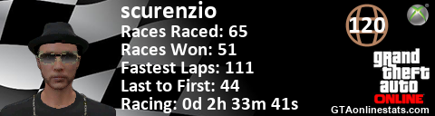 [URL=http://GTAonlinestats.com/showplayer/scurenzio][IMG]http://GTAonlinestats.com/racesignature/scurenzio/sig.png[/IMG][/URL]