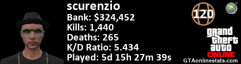 <a href="http://GTAonlinestats.com/showplayer/scurenzio"><img src="http://GTAonlinestats.com/signature/scurenzio/sig.png" alt="scurenzio" border="0" /></a>