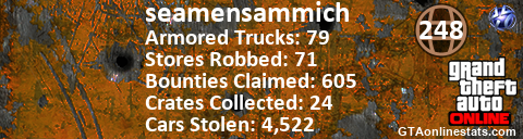 [URL=http://GTAonlinestats.com/showplayer/seamensammich][IMG]http://GTAonlinestats.com/randomsignature/seamensammich/sig.png[/IMG][/URL]