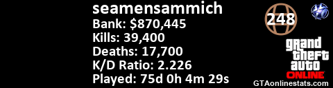 <a href="http://GTAonlinestats.com/showplayer/seamensammich"><img src="http://GTAonlinestats.com/randomsignature/seamensammich/sig.png" alt="seamensammich" border="0" /></a>