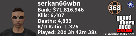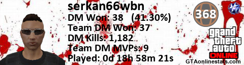 [URL=http://GTAonlinestats.com/showplayer/serkan66wbn][IMG]http://GTAonlinestats.com/dmsignature/serkan66wbn/sig.png[/IMG][/URL]
