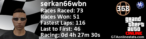 [URL=http://GTAonlinestats.com/showplayer/serkan66wbn][IMG]http://GTAonlinestats.com/racesignature/serkan66wbn/sig.png[/IMG][/URL]