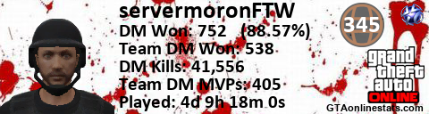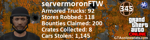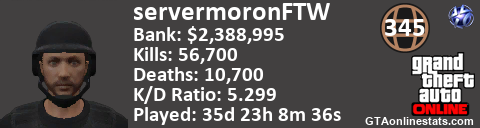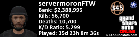 [URL=http://GTAonlinestats.com/showplayer/servermoronFTW][IMG]http://GTAonlinestats.com/dmsignature/servermoronFTW/sig.png[/IMG][/URL]