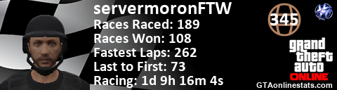 [URL=http://GTAonlinestats.com/showplayer/servermoronFTW][IMG]http://GTAonlinestats.com/racesignature/servermoronFTW/sig.png[/IMG][/URL]