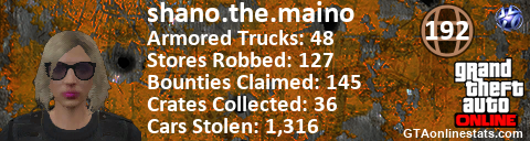 [URL=http://GTAonlinestats.com/showplayer/shano.the.maino][IMG]http://GTAonlinestats.com/crimesignature/shano.the.maino/sig.png[/IMG][/URL]